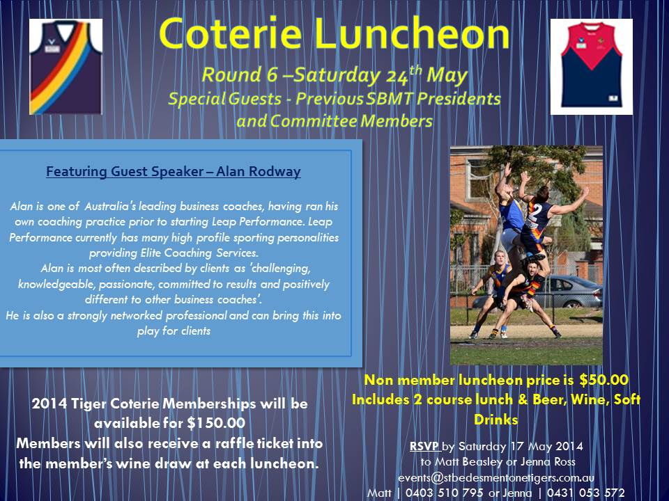 Tiger Coterie Club is back in 2014 – and we need you! Join us for our first Coterie Luncheon for 2014 is this weekend, Saturday 24 May at 12 noon, where we host Old Brighton at home.