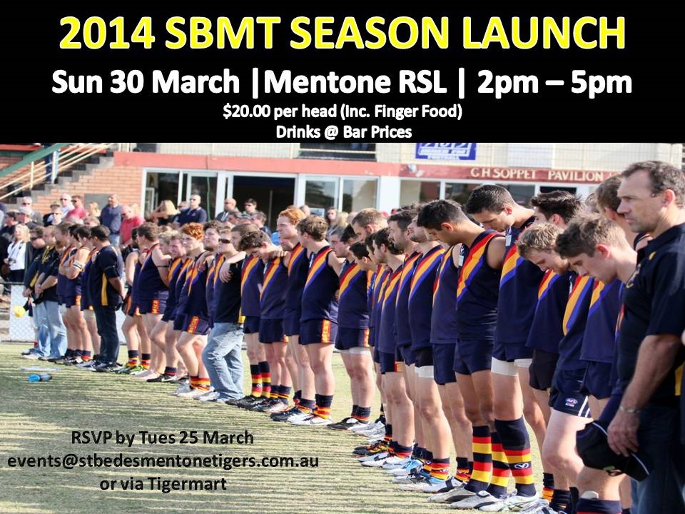 We would love for you to join us for our 2014 Season Launch on Sunday 30th March at the Mentone RSL from 2pm-5pm. $20 per head includes finger food. Drinks are at Bar Prices.