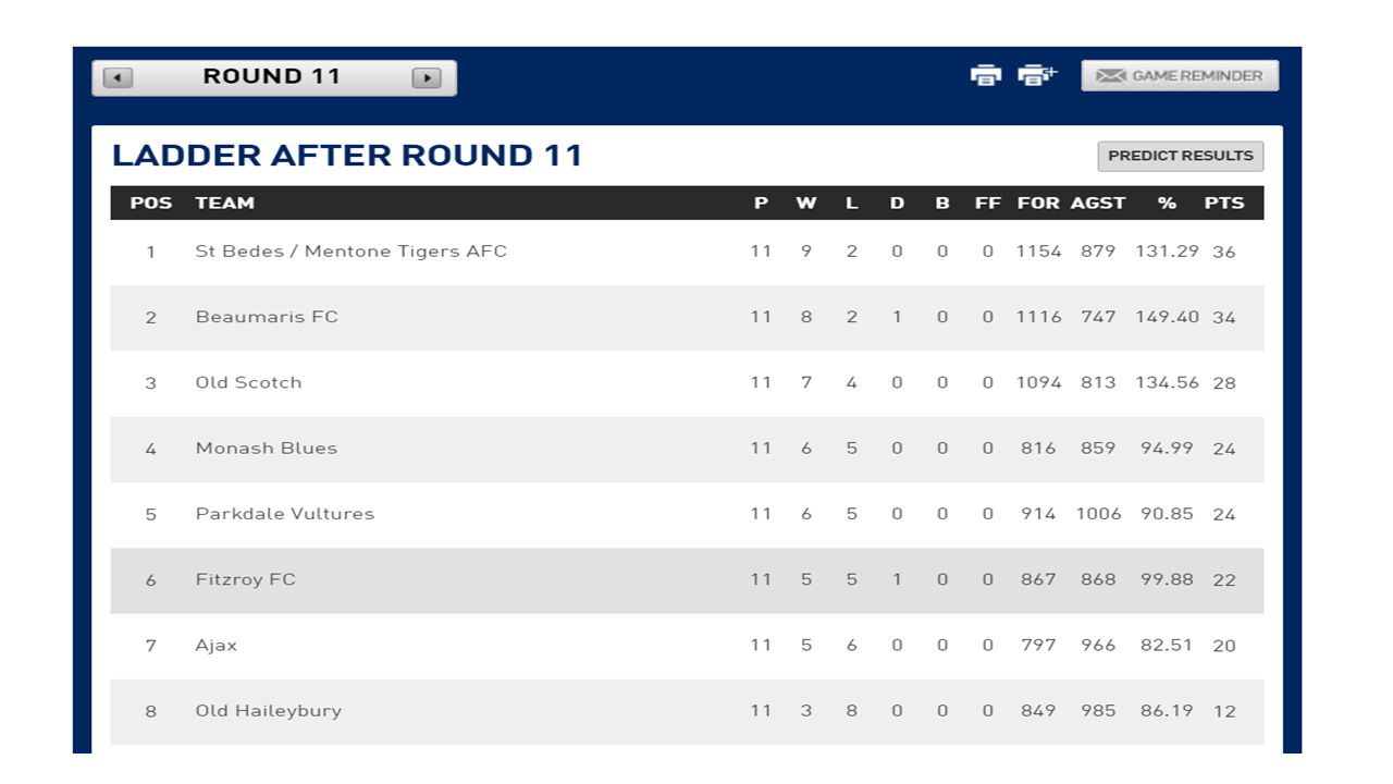 In the second St Bedes, with Ben Dance and Chris Mangoni leading an attacking defensive unit, took control to bang on 3 unanswered goals only for the ladder-leaders to respond in kind to restore their position and take a 10 point lead into the long break.